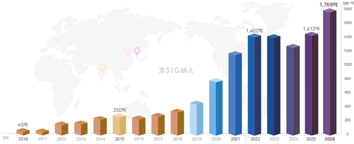 2010년 45억 매출을 시작으로 매년 꾸준히 성장했으며, 2015년에는 250억 2022년에는 1,402억